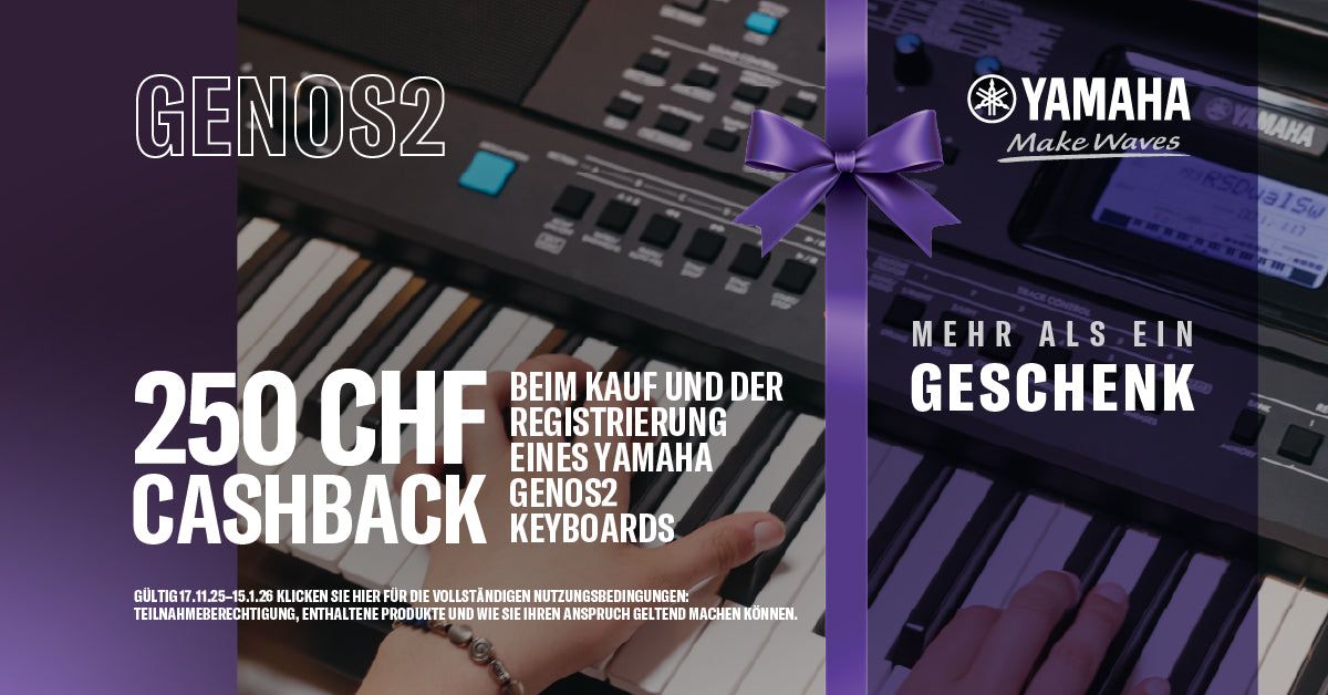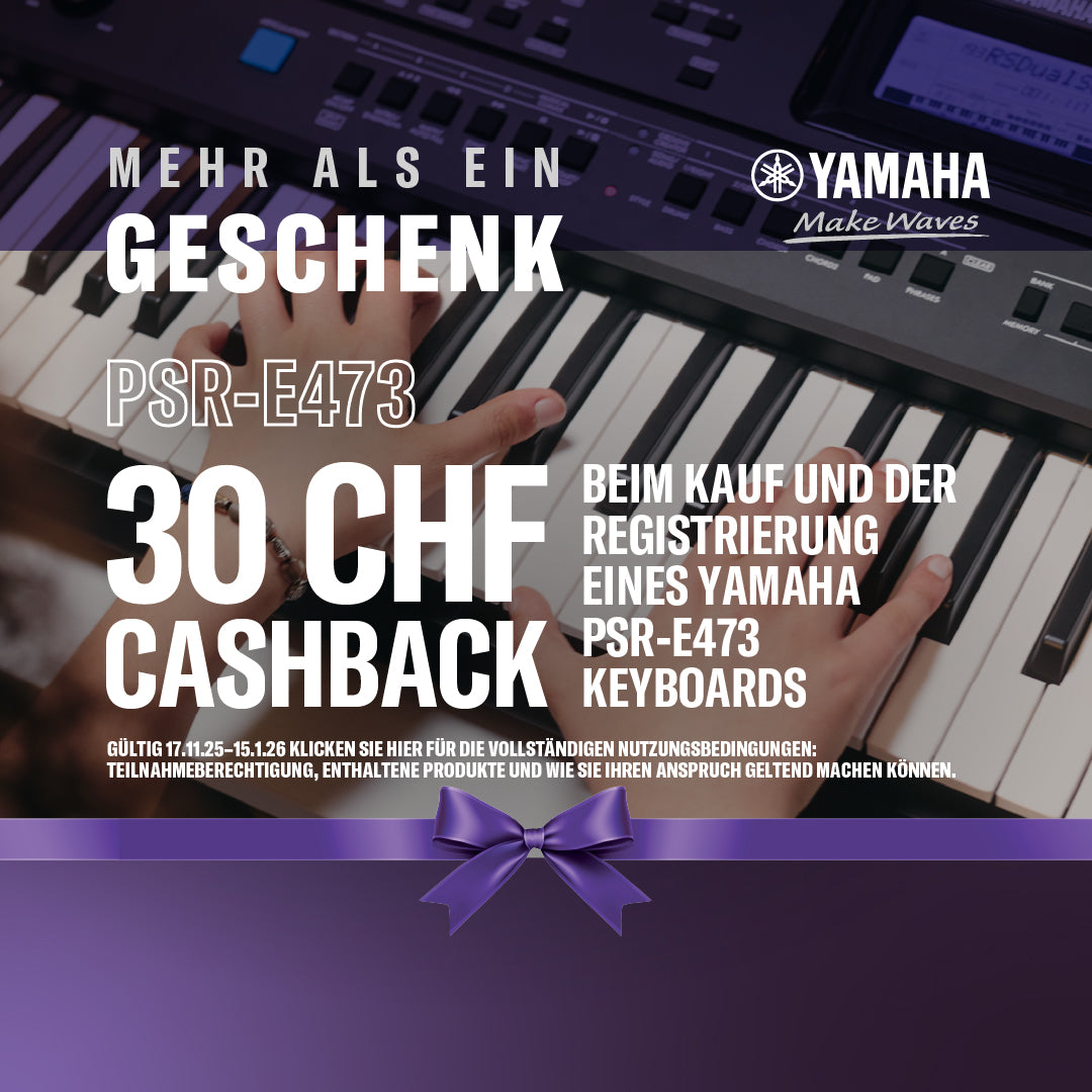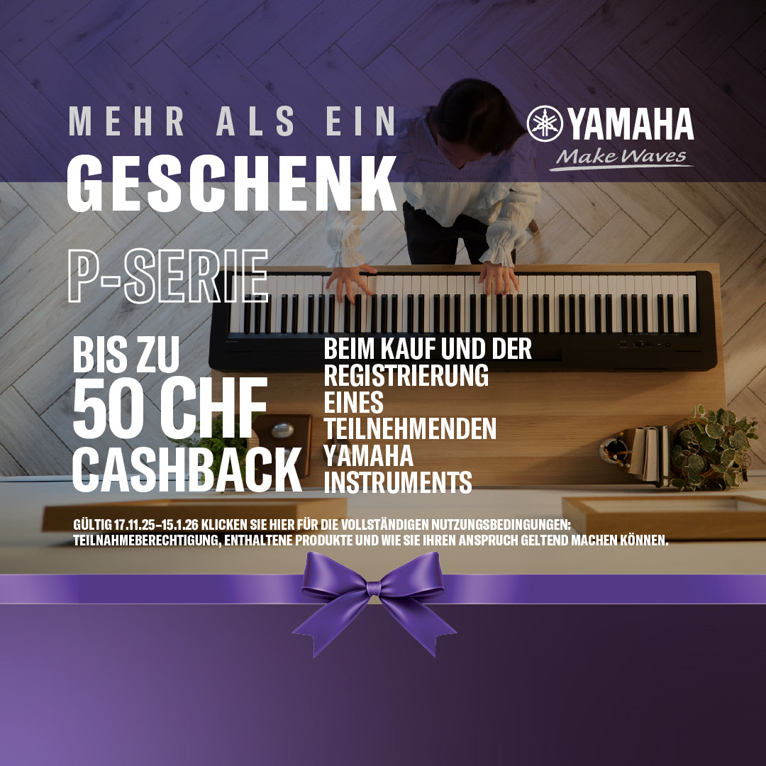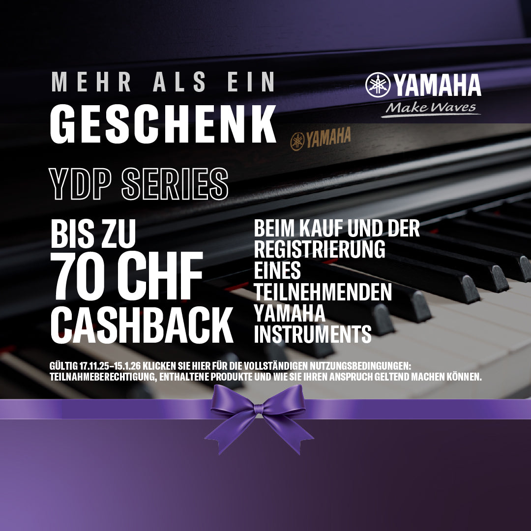 Alle Kunden, die im Zeitraum vom 17.11.2025 bis einschliesslich 15.01.2026 Yamaha Modelle P-145, P-145BT, P-225, YDP165, YDP145, PSRE473, GENOS 2, CLP-825, CLP-835 und CLP-845 kaufen, erhalten bis zu 250 CHF Cashback direkt von Yamaha.